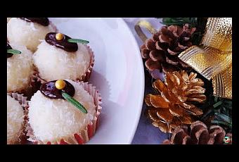 2.- Ponemos el coco restante en un plato y cubrimos las trufas con el coco rallado para hacerlas nevadas. Calentamos 1 minuto la nata en el microondas y fundimos el chocolate en la nata caliente. Ponemos una cucharadita de chocolate sobre cada trufa de coco. Decoramos cada trufa con una bola de caramelo y una hoja pequeña de menta o cualquier otra planta aromática fresca. Dispensamos cada bola en una capsula de repostería y las guardamos en la nevera hasta el momento de servir.
