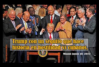 El 16 de junio del 2017 desde Miami Donald Trump revirtió avances alcanzados en los dos años previos en las relaciones Cuba-USA. Para hacerlo se explayó ante una audiencia plagada de gusanos y hasta terroristas, con las figuras de la ultraderecha del Congreso, en un discurso sacado del arsenal de la Guerra Fría, amenazante, mentiroso y lleno de falsas acusaciones, al tiempo que firmó un Memorando, que derogó los acuerdos obtenidos en la administración de Barack Obama.Aun así, el gobierno cubano dio pruebas de serenidad y ha tratado de salvar todo lo posible en beneficio de ambos pueblos, aunque las mayores pérdidas son para el cubano, dado que el bloqueo económico, comercial y financiero se mantiene, a pesar del rechazo de la comunidad internacional y de bloques como la Unión Europea.