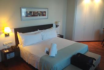 Este se abre completamente hacia la izquierda. Resulta grande, muy amplio, con dos ventanas en la pared frontal. Aquí abajo la puerta de entrada y las casitas que rodean el hotel, pero si levantamos la vista, podemos descubrir allá al fondo los edificios más altos y característicos de la ciudad. Allí delante, justo donde termina el pasillo y entramos en el dormitorio hay un sofa-cama doble tapizado con una tela color vino. Sobre él, un feo cuadro de motivos geométricos. A la izquierda, el display que permite controlar el aire acondicionado, muy eficaz, que encontramos encendido para refrescar la habitación. En su potencia más alta resulta ruidoso, pero en la mínima el ruido apenas se oye.