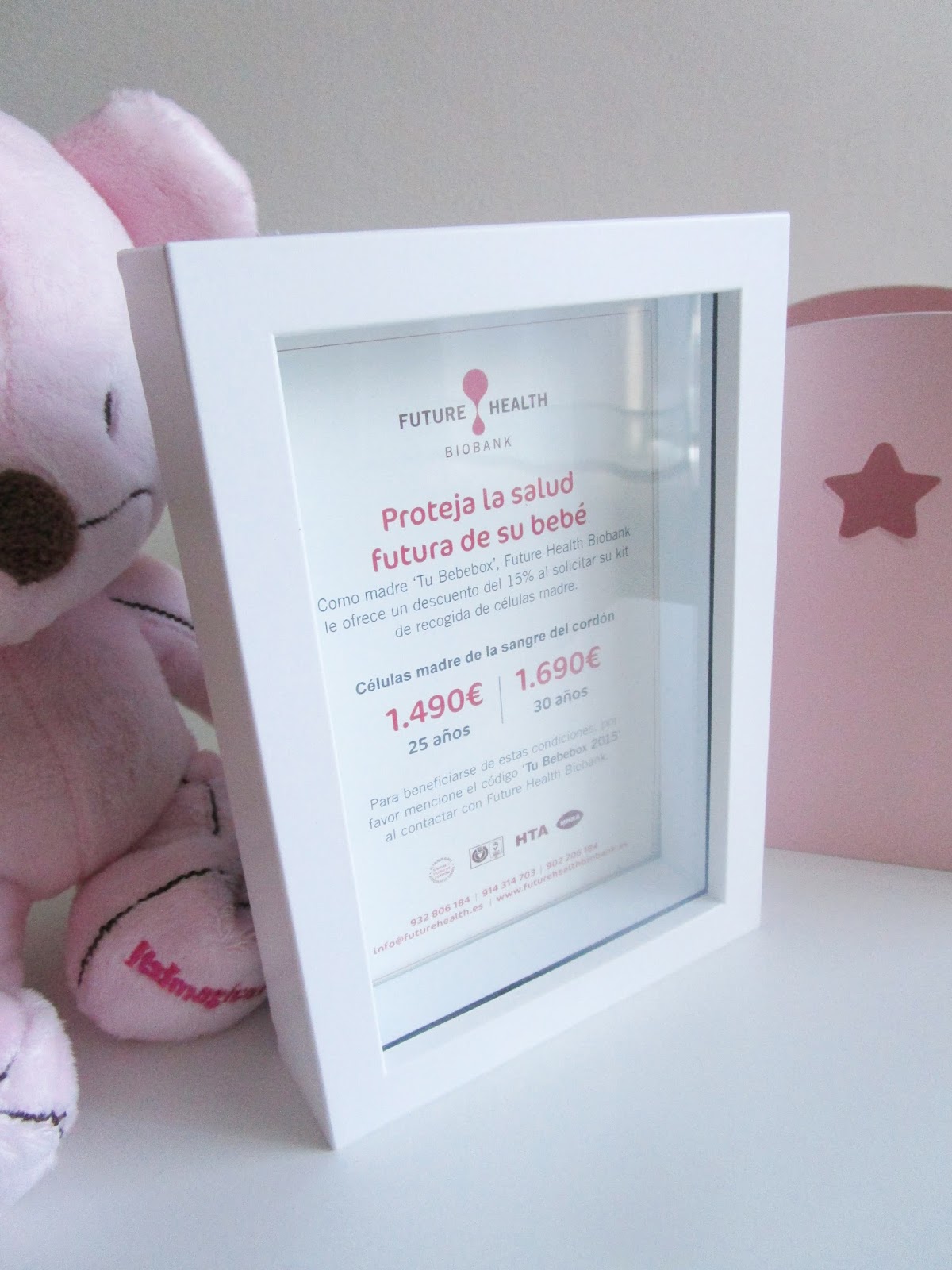 * Cheque descuento de Future Health BioBank+ Marco de Balvi.-Future Health es una empresa especializada en la recogida y custodia de células madre del cordón umbilical del bebé, que como sabéis pueden tener la llave de la salud de nuestro o nuestros hijos, y gracias a Tu Bebebox te ofrecen un 15% de descuento en sus servicios. Por otro lado, Balvi es una empresa catalana de decoración que nos ofrece este precioso marco donde poner la primera foto de nuestro bebé
