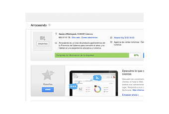 - Ficha de empresa: podemos añadir una fotografía de nuestro negocio directamente, ver la dirección, la descripción, la categoría y el horario. Además, una barra de información nos indica hasta qué porcentaje está completa dicha ficha con la frase “Completa la información de tu empresa”, facilitando hacerlo y, por tanto, optimizándola y mejorando su eficiencia.