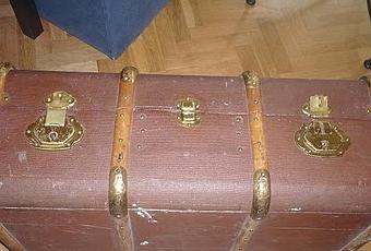 "Tengo un baúl valija, los recantos son metálicos dorados,y sus soportes son de madera. el baúl en si es como de maderas de balsa (bálsamo), pero recubierto por una tela, que parece como gaza ( o antigua tela de los pañales)