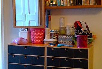 Os pongo una foto de mi tocador, con una cajonera malm para los pañuelos, bolsos y ropa de baño, dos cajoneras fira para el maquillaje y los abalorios y un espejo molger para los potingues"