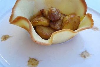 Poner sobre las tulipas las frutas caramelizadas y un poco de la salsa de caramelo que se ha formado, y colocar la Tulipa sobre el plato en el que tendremos hecha una “cama” con la Salsa de Fresa