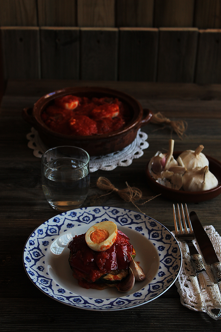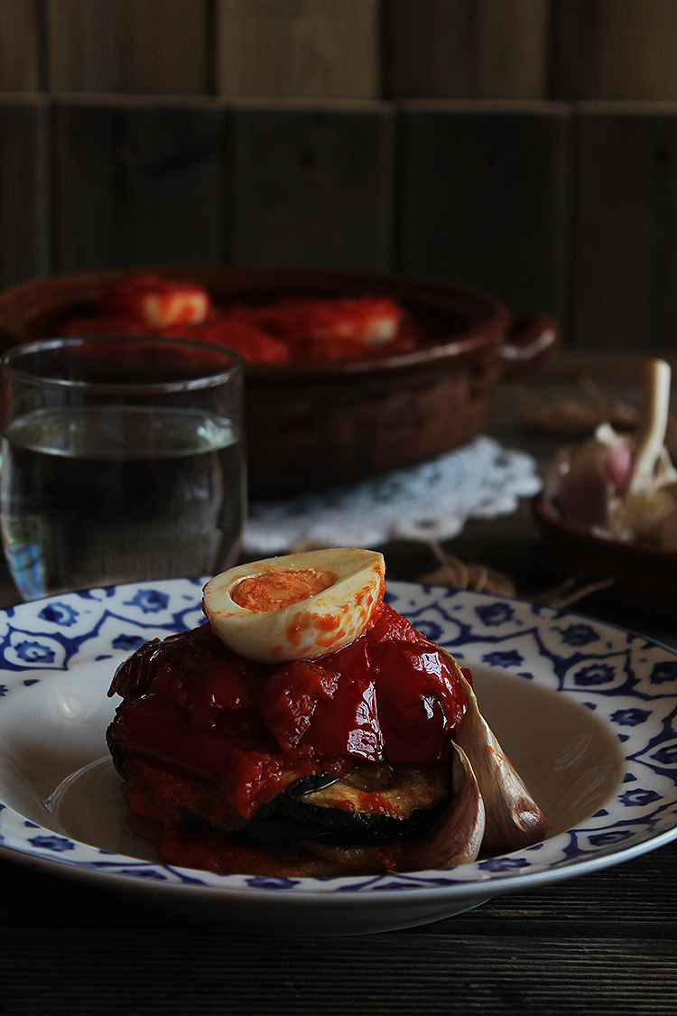 Pelamos los huevos previamente hervidos, los cortamos a la mitad y los colocamos encima del tumbet. Una vez acabada la salsa de tomate la servimos encima de todo el tumbet cubriendo por completo las verduras.
