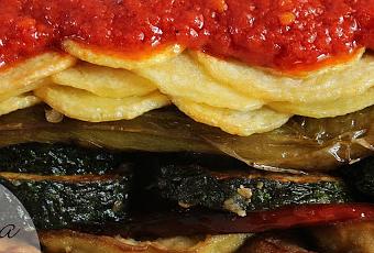 1 calabacín grande 2 berenjenas 1 pimiento rojo 6 pimientos verdes de tipo italiano 3 patatas grandes Salsa de tomate casera Aceite de oliva, sal, harina.