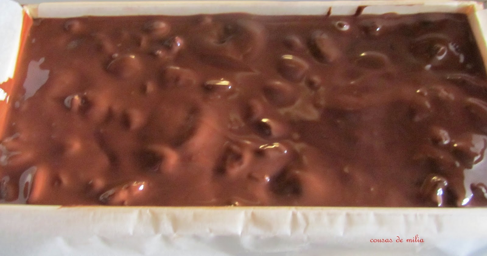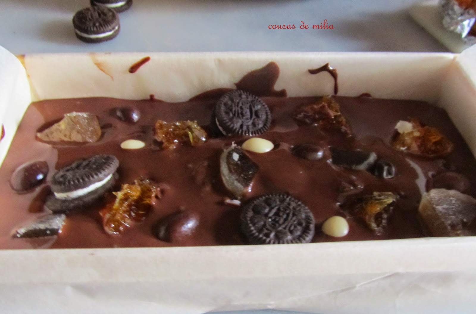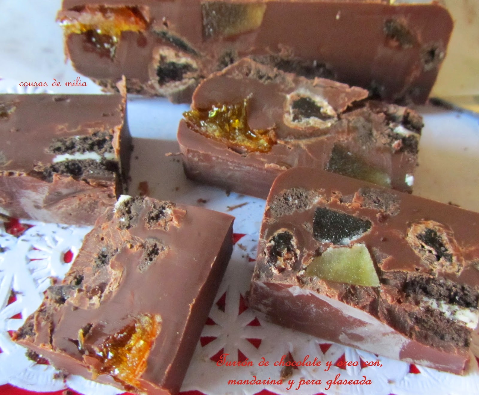 Antes de nada quiero desearos a todos un muy feliz 2015. Estas Navidades me he tomado vacaciones obligadas en el blog, estar sentada no me va del todo bien, aunque la cosa ya ha mejorado ¡gracias a Dios!No tenía pensado publicar ninguna receta navideña, pensaba dejarlas para las próximas navidades, pero esta mañana cuando volvía de la rehabilitación me encontré una amiga lectora del blog, que me dijo, que alguna tenía que poner, ya que no había publicado ninguna... así que os dejo unos de los turrones que preparé para las fiestas... ¡va por ti Pili!Ingredientes:150 g de chocolate negro de cobertura125 g de chocolate con leche para repostería20 g de manteca de cerdo ibérico, o mantequilla1 bolsita de mini oreo de 40 g1 pera glaseada1 mandarina glaseada30 g de conguitosElaboración:Troceamos el chocolate y lo ponemos a fundir (yo lo he hecho al baño maría, pero puede hacerse en el microondas), cuando se haya fundido la mitad del chocolate, lo retiramos del fuego añadimos la manteca y removemos para que se acabe de fundir con el calor residual, tiene que quedar como una crema manejable, pero espesa.