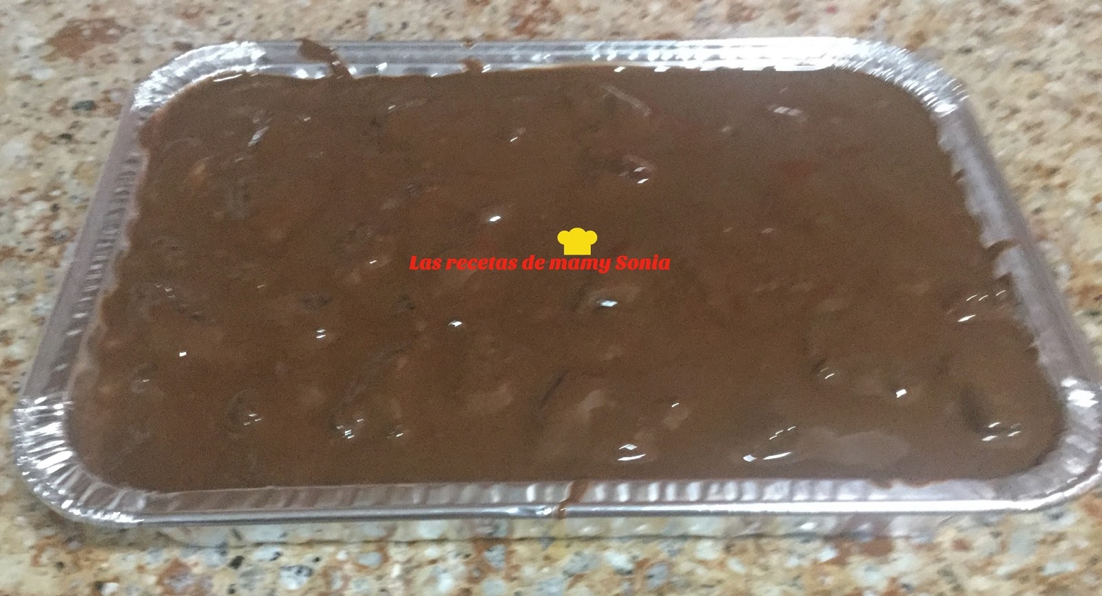Echamos la mezcla del chocolate en un tupper o molde de silicona rectangular(yo he usado como veis en la foto un de aluminio que compre en el chino)Lo podemos dejar así tal cual