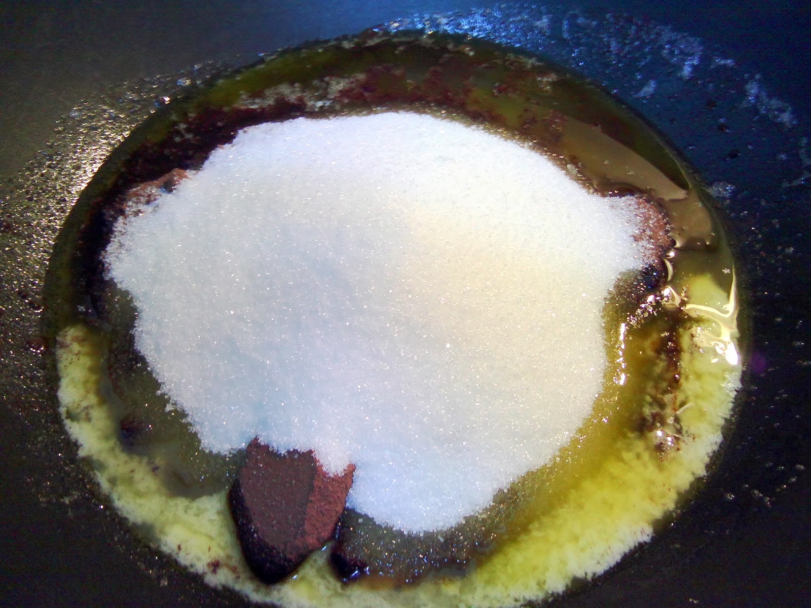 Poner en un wok, cacerola o cazo la mantequilla. Llevar a fuego bajo/suave, cuando comienza a derretirse añadir el cacao y el azúcar. Mezclar con un batidor de varillas.