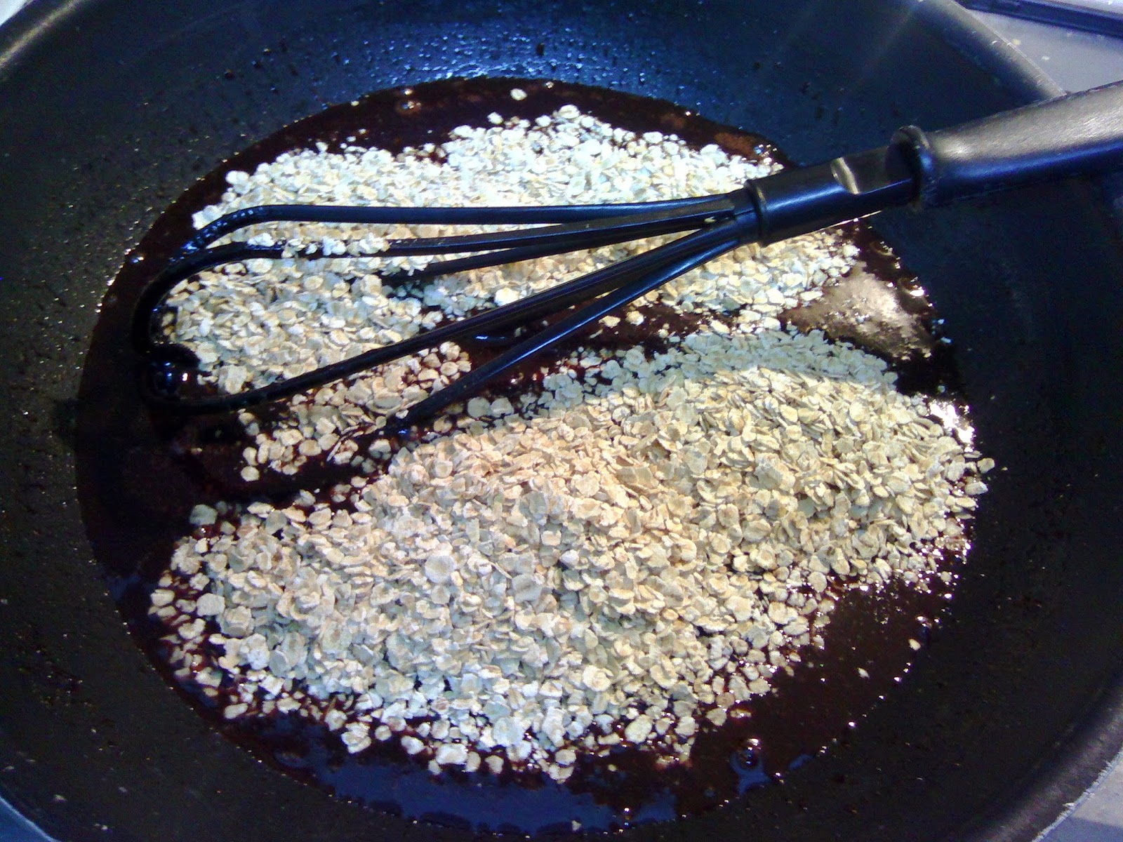 Encender el fuego moderado y mientras se va calentando con un batidor de varillas mezclar todo. Seguir removiendo todo el tiempo hasta que rompa el hervor. Vas a notar que va espesando poquito a poco hasta tener una textura "dulce de leche" floja. Es el momento de añadir las 2 tazas de avena. Remover hasta que rompa el hervor, apartar del fuego y reservar.