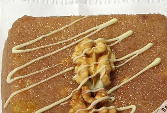 Desmoldamos el turrón, decoramos con un poco de chocolate blanco y medias nueces.