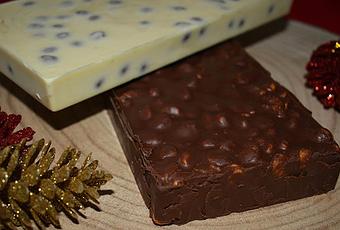 Derretimos el chocolate al baño María en un cazo al fuego (con mucho cuidado de que no le caiga agua), o en el microondas en tandas de 30 segundos vigilando que no se nos queme. Una vez derretido. le añadimos la manteca y cuando ésta se haya integrado totalmente, le añadimos los cacahuetes al blanco, y los quicos al negro. Los ponemos en moldes (mejor moldes de silicona) y los dejamos enfriar a temperatura ambiente (no en el frigorífico) durante 24 horas.