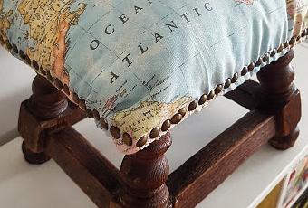 Colocado zona mullida donde la zona de sentarse y forrado con tela de loneta resistente de mapamundi. Remetazo con tachuelas antiguas que tenía ya la butaquita. Le da un toque vintage.