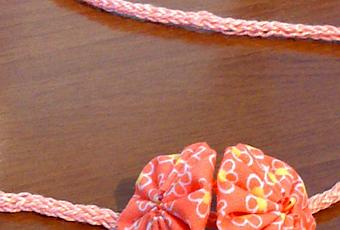 En la foto parece muy grande, pero es pequeño, os lo muestro así para que lo veáis mejor. Detrás hay otro. Ya veis que lo bonito es su simplicidad. He hecho dos y los he atado al cordón. Lo bueno del cordón es que queda elástico y así se adaptará mejor a la cabeza del bebé y no le molestará.En esta entrada de mi blog podéis ver otras flores de tela.