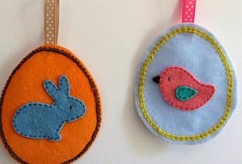 2- Pegamos las piezas del conejo y el pájaro a los huevos y bordamos los motivos.