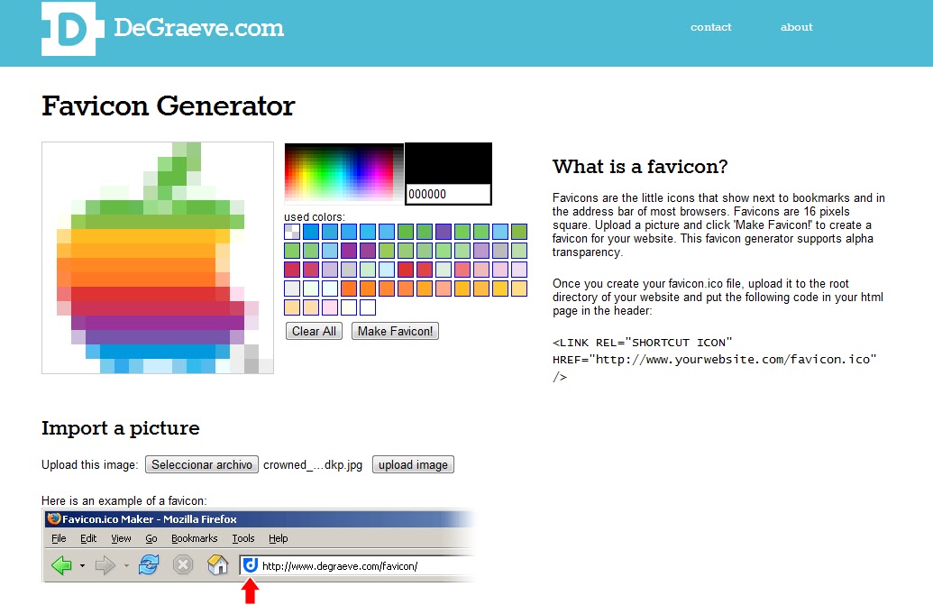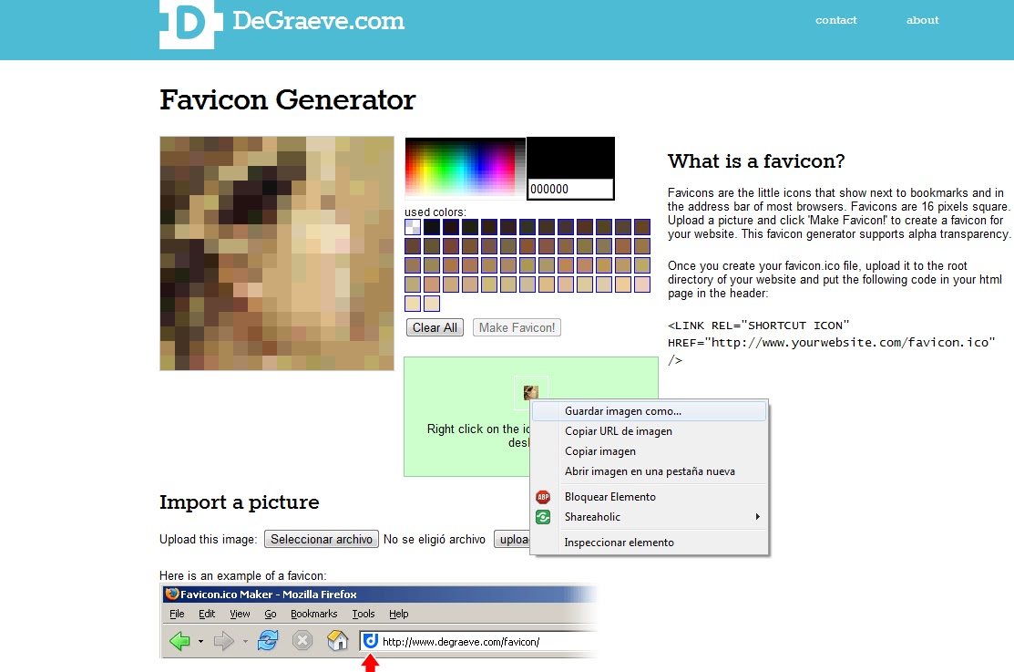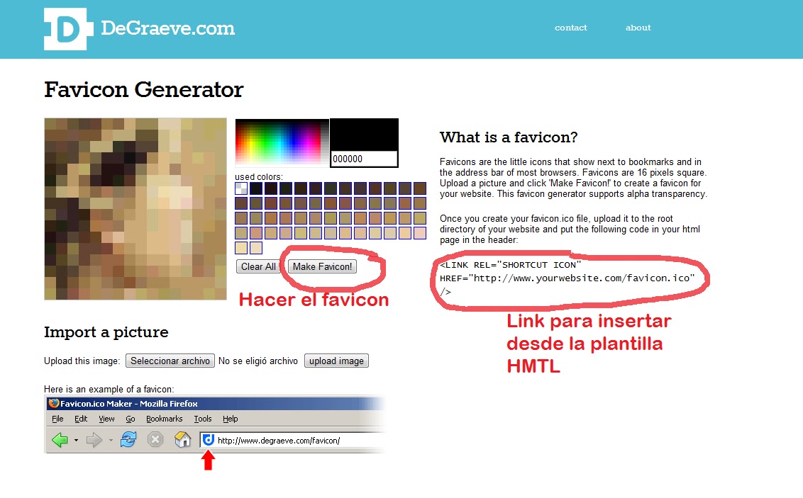 En este caso les hablaré del FAVICON . Pero, ¿que es el favicon? El favicon no es más que el icono que se encuentra en el extremo izquierdo de la barra de dirección, esta imagen esta asociada directamente a nuestro blog. Pero ¿donde puedo crear esta imagen? y ¿ como colocarla?. Pues bien sigue estos pasos y obtendrás tus respuestas. 1.-Lo primero que tienes que hacer es dirigirte a esta pagina: http://www.degraeve.com/favicon/ 2.- Allí deberás seleccionar la imagen que quieres que aparezca y luego de das click a upload image (subir).4.- Como último paso puedes incluir el favicon desde la plantilla HTML ya que te suministraran en código necesario.