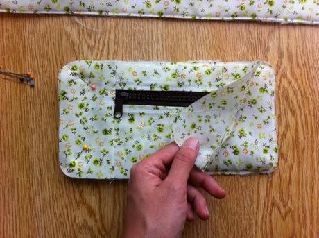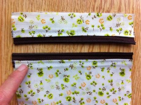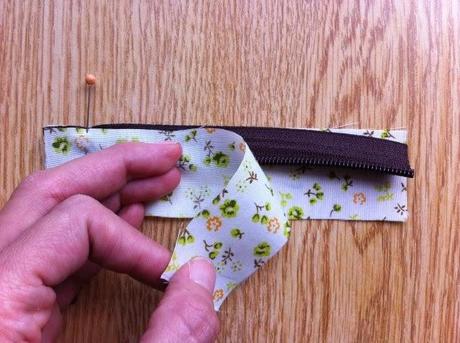 Ya que tenemos estas tres piezas listas vamos a preparar la cremallera para el bolsillo exterior. La medida de la cremallera será igual al largo de las tiritas (no.6), sujetamos con alfileres como se muestra en la foto a una distancia de 1/2 cm. del borde: