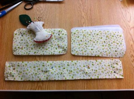- 2 piezas en tela estampada de 12x7 cm. para los laterales del bolsillo exterior (redondear uno de los lados mas largos igual que como hicimos con las piezas de la base).