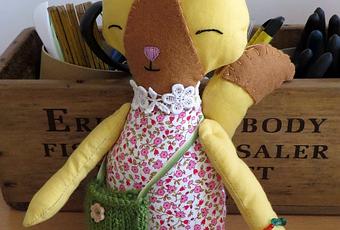Hace tiempo que hice esta muñeca. Al principio no me gustó mucho el resultado, pero gracias a su dulce carita le he ído cogiendo cariño.Some time ago I made this doll. At that time I didn’t like it very much, but now, i think it’s so lovely.Para confeccionarla necesitamos tela, floca, fieltro e hilo de coser y de bordar.We need fabrics, polyester filling, felt and thread.1- Primero imprimimos los patrones, que podéis descargar aquí. Y los pasamos a las telas. No vayáis con tantas prisas como yo y planchad las telas antes.1- Print the patterns that you can download from here and draw on the fabrics. Don’t rush, like me, and iron the fabrics first.2- A continuación hacemos la cara de la muñeca, bordando los rasgos y haciéndole el morro con fieltro.2- Then, embroider the face and make a felt nose.3- Encarando el derecho de las telas, cosemos los brazos, las patas y la cola, dejando un hueco para darle la vuelta y rellenar con floca. En los brazos y la cola cerramos el hueco a punto escondido y en las patas dejamos el hueco en la parte superior que después cosemos directamente al cuerpo, así que no las cerramos. En el patrón tenéis dos modelos de patas, podéis elegir el que más os guste.3- Matching both front parts of the fabrics, sew the arms, the legs and the tail, leaving a hole to turn the inside out and refillwith polyester filling. Close the arms and the tail using hidden stitch but leave the hole in the upper part of the legs to sew later to the body. You can choose between two leg patterns.4. Después cosemos la cabeza al cuerpo, tanto la parte delantera como la trasera. Colocamos las patas en su sitio, por dentro para que queden fuera al darle la vuelta y, tras hacer pequeños cortes en los márgenes, sobre todo en las zonas curvadas, cosemos todo encarando el derecho de las telas y dejando un hueco para darle la vuelta y rellenar con la floca.4- Now sew the head to the body, both the front and the back pieces. Put the legs in the body and after making some cuts at the curved edges, sew matching both front parts of the fabrics and leave a hole to turn the inside out and refill with polyester filling.5- Sólo nos queda cerrar el cuerpo a punto escondido, coser los brazos y la cola y poner a la muñeca los adornos que queramos.5- Finally, close the body using hidden switch, sew the arms and the tail and decorate the doll.