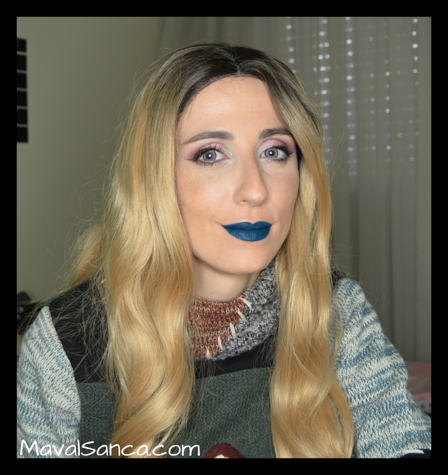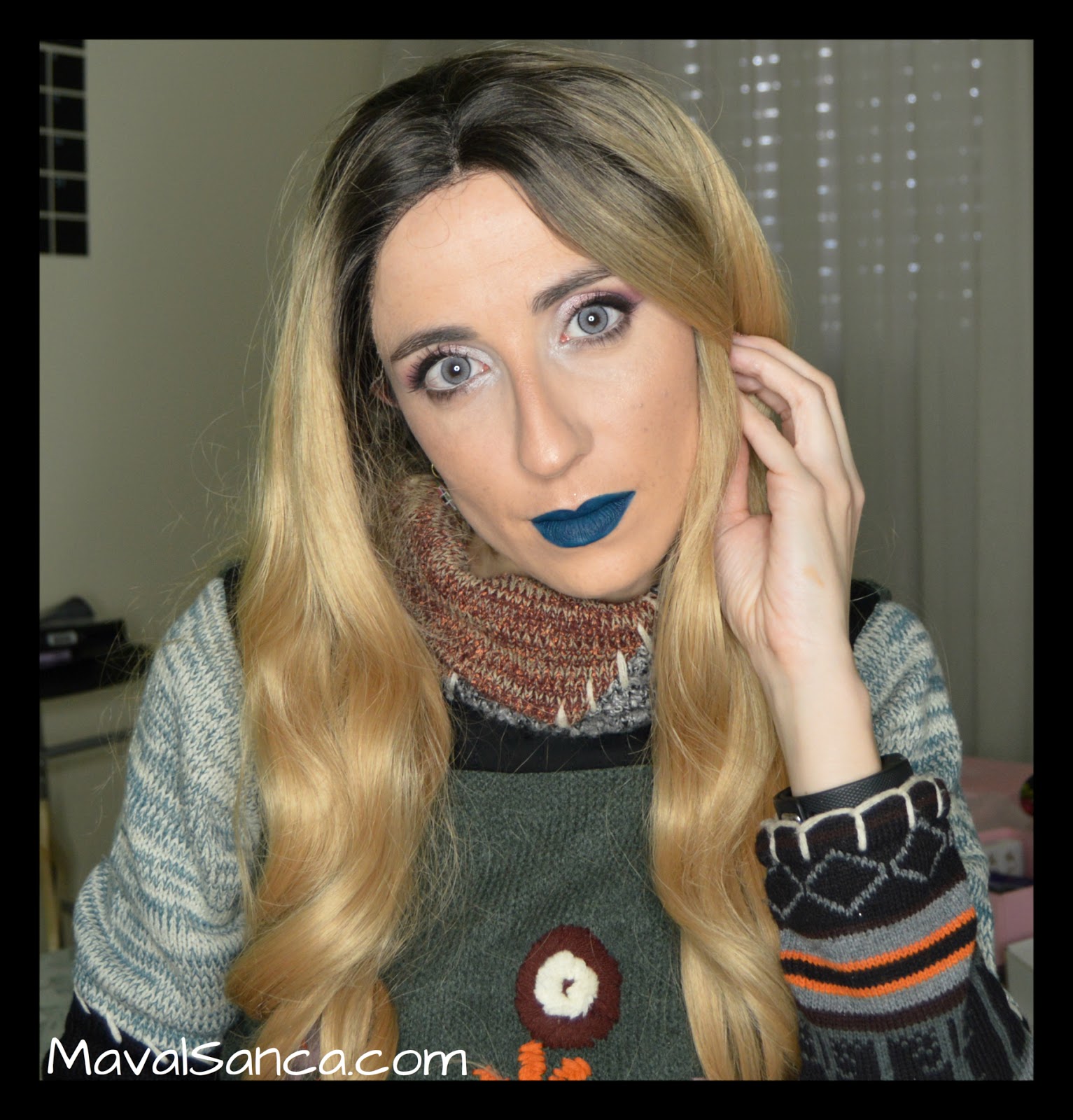 En los labios llevo un labial líquido fijo y mate en color azul turquesa oscuro.
