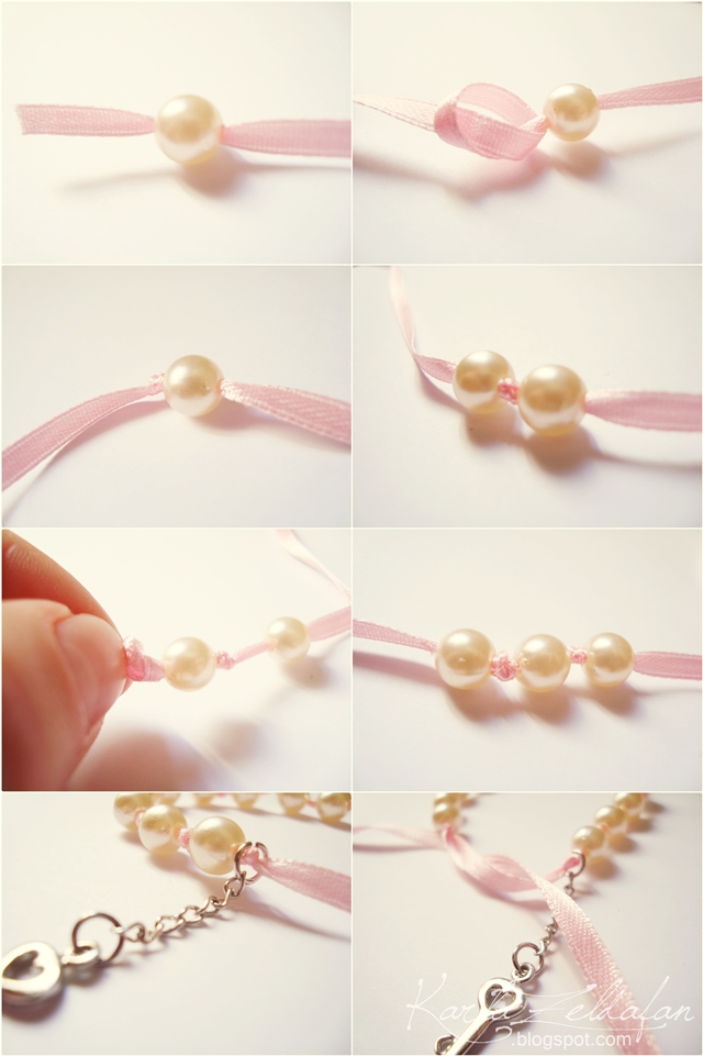 Primero debes colocar una perla en la cinta, después hacer un nudo, y luego introducir la siguiente. Luego harás un segundo nudo, pero este lo debes empujar con los dedos, como muestra la imagen ya que debes guiar el nudo lo mas cerca posible de la perla. Y así hasta llegar a la última perla (la cantidad de perlas depende del ancho de tu muñeca). Por último debes colocar el dije como muestra la imagen. Y a disfrutar de tu nuevo accesorio!