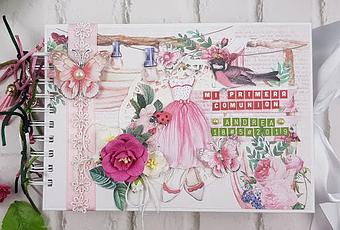 Para decorar he usado la preciosa colección Princes Garden, así como la hoja de tarjetas y la de recortablesque contiene unos dibujos preciosos que son ideales como elementos decorativos.La encuadernación la he realizado con anillas decoradas con hilos y algunos charms: