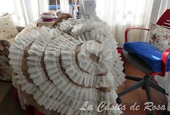 Tenia también un resto de un visillo que corte en tiras de unos 10 cm. ; después fui pegando a maquina tira por tira plegando la tela a ojo y haciendo unos semicirculos cada vez mas abiertos hasta llegar al borde inferior.