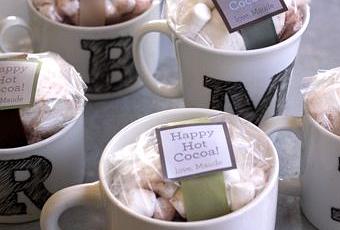 Les regalaremos una taza de desayuno a cada uno personalizada con su inicial dibujada y con una bolsita para prepararse un delicioso chocolate a la taza.