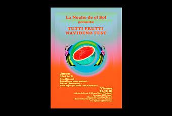 Hay noches en El Sol que pasan a ser una noche digna de recordar; en este caso será por partida doble. El festival será una propuesta bajo la idea de Tutti Frutti Navideño con sabor a festival electrónico y de esencia de pista de baile con alma.En La Noche de El Sol encontramos fiesta, esencia electrónica con sabor a disco, indie, house y sonidos hermanos; ahora llegan las jornadas del 20/12 y 21/12 en su sala con este festival y un cartel nacional lleno de nombres de interés; la fiesta propuesta trae a lo mejor de lo que se puede encontrar actualmente en la escena musical dentro de las pistas de baile y propuestas de la noche de Madrid con sabor a esencia nacional.