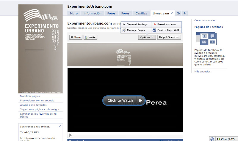 Estimados lectores, como parte de las mejoras en nuestro sistema web; Ahora no necesitas salir de facebook para ver nuestra transmisión web. para conectar a la misma basta coningresar a nuestra pagina de facebooky hacer click en la pestaña "Livestream" incorporamos una biblioteca con mas de 80 horas en multimedia /que va en aumento/ a tu disposición.Ademas incorporamos dos señales adicionales en paginas de campaña, el canal musical (en beta) fue incorporado en lacampaña por redes wifi gratuitas. favor difundir, compartir, distribuir, gritar o transmitir... www.experimentourbano.com24 horas al dia - 365 dias al año... ARQUITECTURA - DISEÑO - CIUDAD.