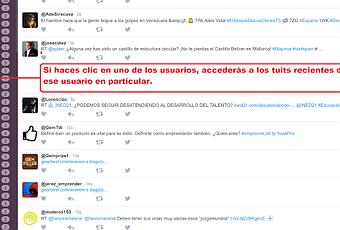 Permite, por tanto, ver todo el timeline en tiempo real o solo los tuits de un usuario. En la vista general si presionas el icono "+" que se encuentra a la derecha junto a un tuit, te mostrará todos los tuits recientes de esa cuenta. Lo mismo sucede si haces click en el nombre de usuario en la barra lateral.