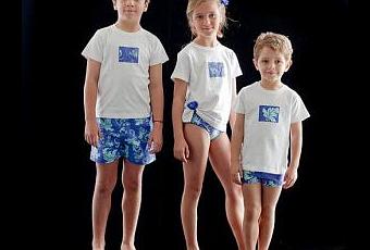 Modelo 1, es un estampado azul con bañador estilo bóxer para papá y bañador niño ó culetín niña, con el estampado a juego