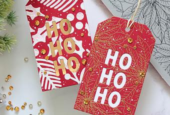¡Hola a todos! Hoy quiero enseñaros otro proyecto hecho con productos de la colección Stamptember. He usado el troquel "Ho Ho Ho Tag Die" junto al sello "Poinsettia Background" y el sténcil "Holiday Foliage".