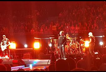 Vamos a la intermission, vamos a la barra y al excusado y a afrontar que otra vez está aquí Elevation. Los problemas hay que afrontarlos de frente. Y de la misma manera que las preocupaciones sobrepasan al protagonista de Until the end of the world hasta llevarle a perder la inocencia, aquí el gentío te pone en tu sitio dándolo todo con los aulliditos y toda la pesca. Elevation es un misil en directo nos pongamos como nos pongamos, por más que lo hayamos escuchado trillones de veces y pueda ser simple y repetitivo. Pero qué caramba, qué gusto da ver las gradas del WiZink con todo el personal en pie y pegando botes sobre los asientos. Al final esto es bastante básico y se trata de encaramarte a lo alto y pegar botes porque sí. Con Vertigo ocurre exactamente lo mismo y resulta aún más contagioso. Rock certero, relativamente ramoniano, directo y sin complicaciones. Eso funciona y mucho.