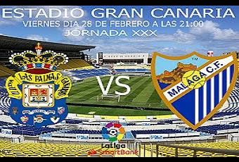 Este fin de semana se juega la 30ª jornada de la liga SmartBank, y el Málaga abrirá la jornada jugando contra la UD Las Palmas, en el Estadio Gran Canaria el viernes día 28 de Febrero a las 21:00 horas.La UD las Palmas es un equipo entrenado por Pepe Mel, lo cual es sinónimo de buen trato al Balón y querer controlar el juego a base de tener la posesión del Balón.