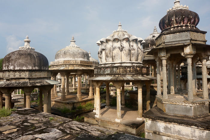 Porque tampoco podemos irnos de la ciudad sin acercarnos al crematorio de las afueras, en Ahar. Los hinduistas queman a sus muertos en un lugar cercano y, luego, echan sus cenizas obligatoriamente al Ganges, el río sagrado por excelencia. La pira del noble muerto, según la tradición, la enciende el hijo; pero es el nieto quien construye su cenotafio, un monumento de homenaje y recuerdo, a modo de panteón mortuorio vacío, que consta de una base alta escalonada sobre la que se asientan varias columnas en abierto que sostienen un dosel techado. Los reyes de Udaipur y sus familiares se fueron enterrando aquí a lo largo de varios siglos, constituyendo un conjunto arquitectónico con cientos de chattis (así se llaman en hindi esas construcciones) de una gran belleza: artísticas gradas, columnas y cúpulas en piedra blanca, ennegrecida por el tiempo y lo descuidado del lugar.