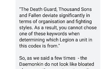 El mini-codex MEC Demonkin parece que tiene algunas excepciones mas. Al parecer, y como se puede ver en la captura de pantalla, ni los codex Mil Hijos ni Guardia de la Muerte pueden beneficiarse de las unidades de los Demonkin. Tampoco puede haber Demonkin con los Ángeles Caídos. Por lo que no puede haber unidades Demonkin que sean de Mil Hijos, Guardia de la Muerte o Caídos.