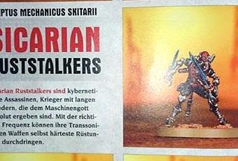 Gracias a Mark Gottlieb,tenemos sacados de su pagina de FB estas dos fotos de los nuevos Sicarian.Es un kit doble eliminatorio,que permite montar Ruststalkers o Infiltrators.Están sacados de la próxima WDW,son uno de los lanzamientos de la semana que viene y aunque las hojas están en alemán,lo que mas importa son las fotos,que son claras.Parece ser que son 5 por caja y no diez como los Skitarii que salieron la semana pasada.Esta claro que son tropas de cuerpo a cuerpo,unas puras de combate cuerpo a cuerpo y otras con opción de algún arma de disparo a corta distancia.Su nombre,Sicarian viene de Sicario,así que ya os podéis hacer una idea de para que sirven...