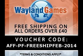 Hoy es el último día de gastos de envío gratis en pedidos de más de 40 libras en Wayland Games. La promoción termina hoy 19 de febrero, por si alguien está interesado. El código para conseguirlo es el que aparece en el cupón: AFF-PF-FREESHIPFEB-2014 Para más información pasaros por la web de Wayland Games.