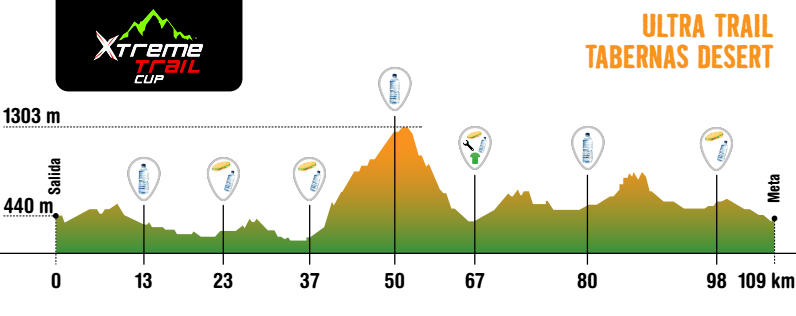 El Ultra Trail Tabernas Desert en su modalidad de 109 kilómetros será mi "examen" para los 101, con un desnivel y distancia más duros que los que encontraré en la propia prueba, siendo ideal para probar táctica de carrera y material; si llegase sin plaza... competiremos al máximo nivel en ella.