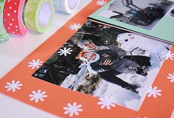 He repetido el mismo formato: cartulinas de colores tamaño Din A4 cortadas por la mitad y fotografías a tamaño normal (10×15 y 13×18)y justo a la mitad (7×10) para combinarlas y que una página no esté ocupada sólo por una, alternando colores y usando el mismo tono para portada y contraportada. La estructura también es la misma: primero fotos de la familia, padres, abuelos, primos y tíos, y segundo fotos de las cosas que le gustan (tractores, animales, trabajar en la huerta, los cumpleaños…) pero he cambiado los materiales.