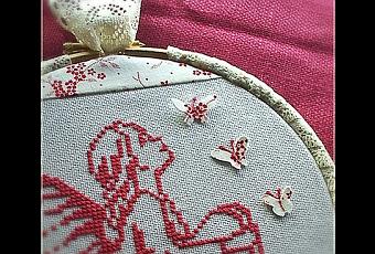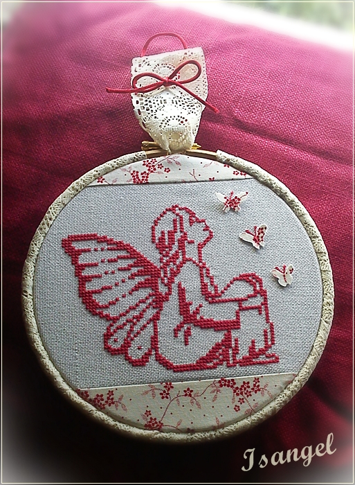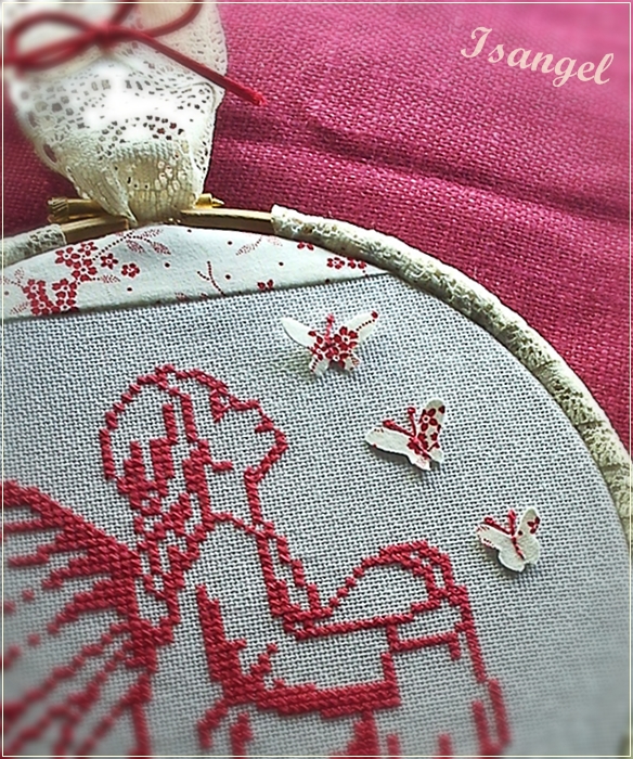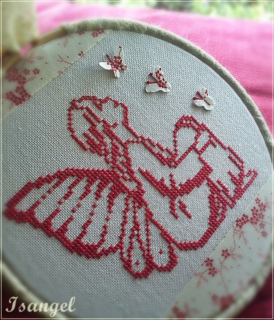 Hola amig@s, os quiero enseñar el ultimo bordadito que he hecho. Aunque esta montado en un bastidor no formara parte de los mios, ha sido un regalo que quería hacerle a una amiga, un pequeño detalle de agradecimiento.Ultimamente me siento rodeada de grandes y excepcionales personas, y me siento muy afortunada de ternerlas cerca, incluso aquellas de las que me separan muchos kilometros, pero solo de distancia física, únicamente eso. En el fondo están tan cerquita mía...Bueno, este bordado quería que resultara dulce y delicado, y buscando entre mis revistas encontré una de Marabuto, Fées. En ella vienen muchos graficos de pequeñas haditas, ángeles, etc... Así que escogí esta que me gusto mucho.