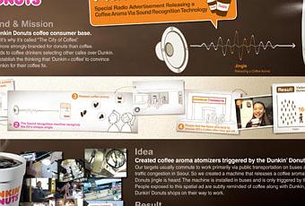 Dunkin´ Donuts Corea del Sur y la agencia Cheil lanzaron el año pasado una innovadora campaña publictaria que llevaba por nombre “La radio del sabor” (Flavor Radio). Para llamar la atención sobre su línea de cafés, Dunkin’ Donuts instaló unos pulverizadores con aroma de café en varios autobuses urbanos de Seúl. Los pulverizadores estaban programados para rociar aroma de café en los autobuses cada vez que se escuchase un anuncio de Dunkin’ Donuts por la radio. De esta manera, el mensaje publicitario quedaba reforzado con una experiencia sensorial real.