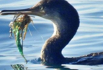 Un cormorán marino con un sedal y restos de anzuelo visiblemente enganchados, dificultando su capacidad de alimentarse libremente.