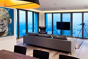El salón se compone de un acogedor y cómodo sofá y algunos detalles más, como una alfombra, una mesita y un sillón relax. La vista se orienta hacia el horizonte urbano.