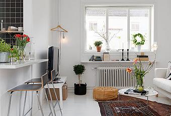 Otro día mas os traigo un apartamento, en esta ocasión con un claro estilo nórdico, marcado por la sencillez, luminosidad y las lineas puras, con el color blanco y negro como protagonistas. Sus escasos 41 metros cuadrados se distribuyen en cocina abierta hacia el salón, solo separada por una barra alta con taburetes que hace la vez de comedor, creando así una estancia amplia.
