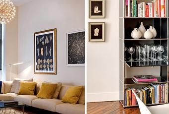 Este apartamento de Brooklyn tipo loft está en un edificio del siglo XIX y está lleno de piezas de diseño. En el salón-comedor-cocina que están unidos preside una bonita mesa de madera con sillas de Patricia Urquiola y lámpara de Jasper Morrison. En el dormitorio, las vigas de madera originales del edificio hacen de cabecero y un antiguo banco de cuero y un conejo disecado de una tienda francesa dedicada a la taxidermia le dan un toque vintage a la habitación combinado con la lámpara de Walter Gropius y el sillón Eames.