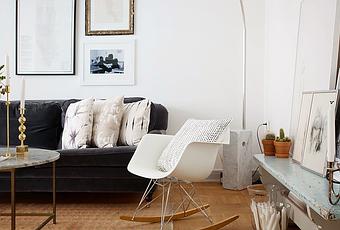 El resto del mobiliario, son piezas elegidas con mucho cuidado y la mayoría de ellas, piezas de diseño, como por ejemplo la lámpara arco o la silla-mecedora plastic de los Eames. (Si quereis saber más sobre esta lámpara de diseño visita este otro post AQUÍ)