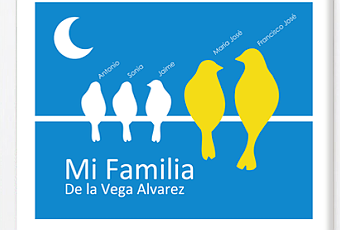 Original representación familiar con pajaritos, que da la posibilidad de introducir el nombre de la familia, de papá, de mamá y hasta 3 hijo/as. Lo podrá encontrar en Babyprint.