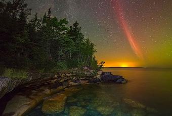 Como su nombre indica, los arcos de protones no son causados por electrones sino por protones más masivos que bombardean la atmósfera de la Tierra después de un evento energético que ha tenido lugar en el Sol. En la imagen, la luminosidad amarilla del horizonte proviene de la ciudad de Marquette (Michigan, EE.UU.) En primer plano, las rocas azules y amarillas del Lago Superior están iluminadas por una linterna led. A la izquierda del arco de protones rojo está la banda de la Vía Láctea .